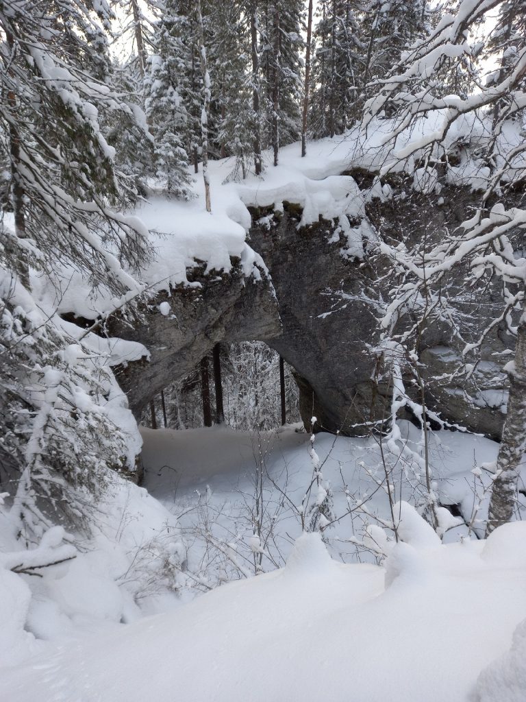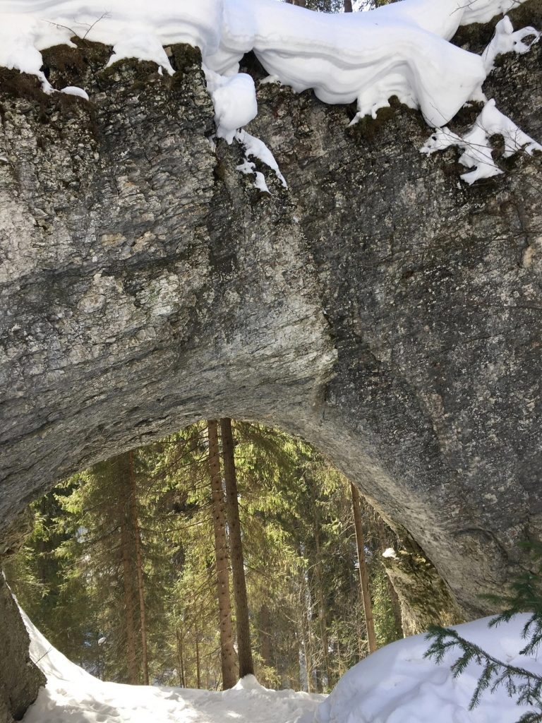 В 11 ч прибытие к началу маршрута. Едем на снегоходах от поселка Усьва мимо ж.д вокзала, где снимали фильм «Чук и Гек», далее по красивой лесной дороге 13 км до избушки Лешего. Там пьем чай. Поднимаемся на Талицкую Арку пешком. Гуляем, фотографируемся. Спускаемся и возвращаемся к избушке Лешего. Далее пешком идем до Большого Талицкого грота по лесной тропе (700 метров). Ходим по гроту, фотографируемся. Можно залезть в небольшую пещеру в гроте. Возврат в избушку Лешего.