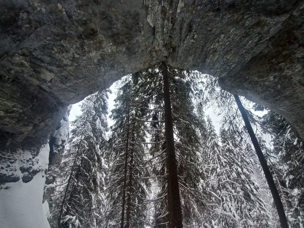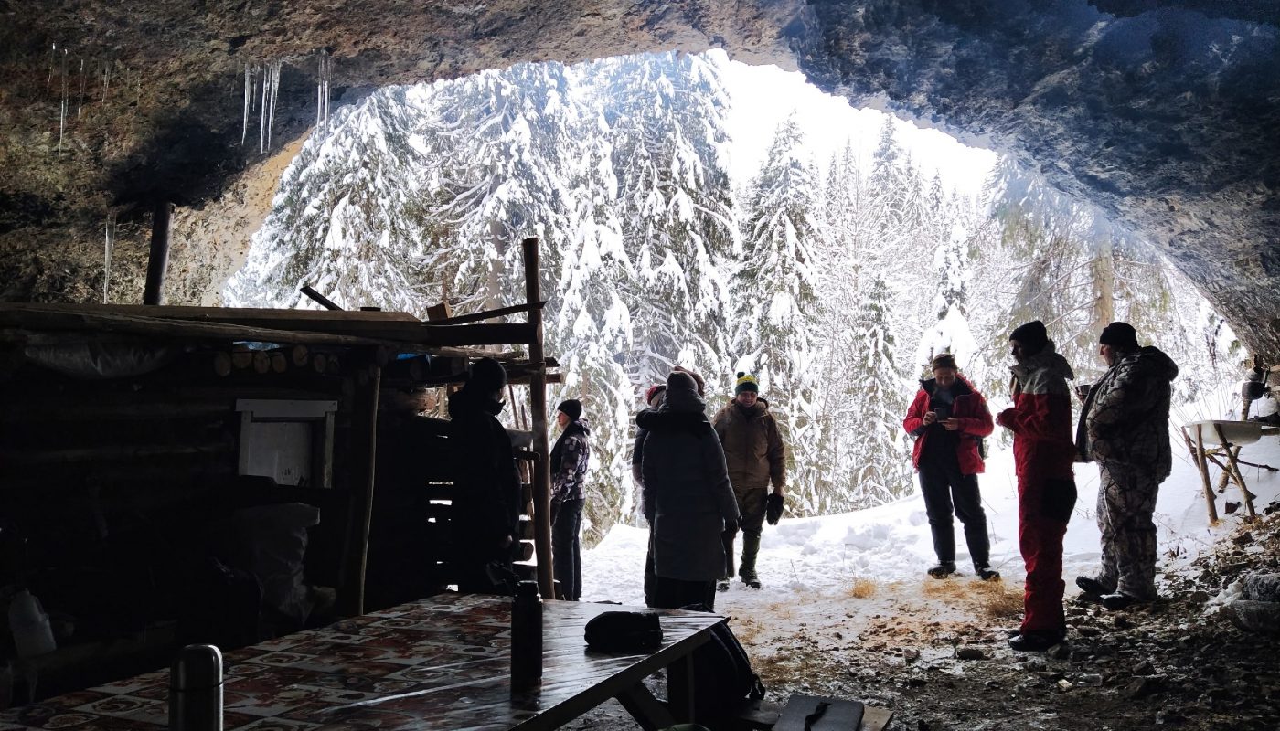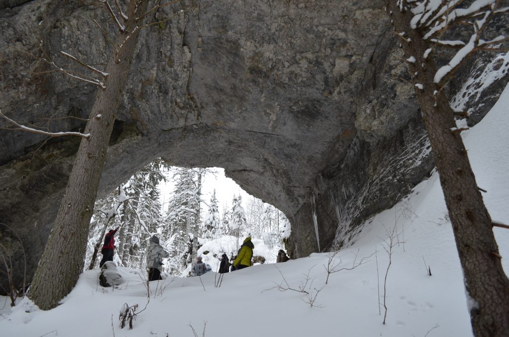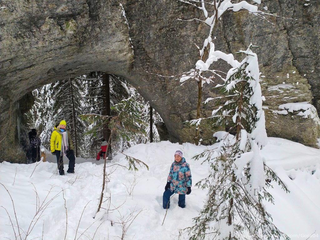 В 11:30-12:00 — прибытие к началу маршрута. Едем на снегоходах по красивой лесной дороге 13 км. Поднимаемся на Малую Талицкую Арку пешком. Гуляем, фотографируемся. Спускаемся и идем в грот к избушке. Пьем чай. Далее пешком идем до Большой Талицкой Арки по лесной тропе (700 метров). Ходим по гроту, фотографируемся. Можно залезть в небольшую пещеру в гроте. Возвращаемся в Талицкий грот к избушке.