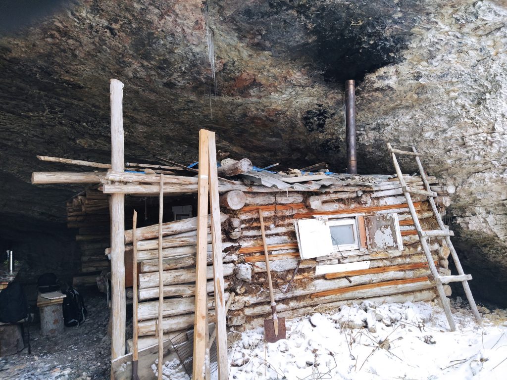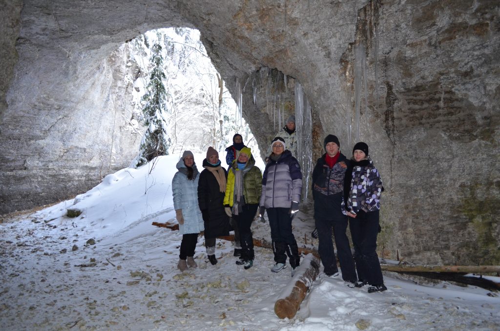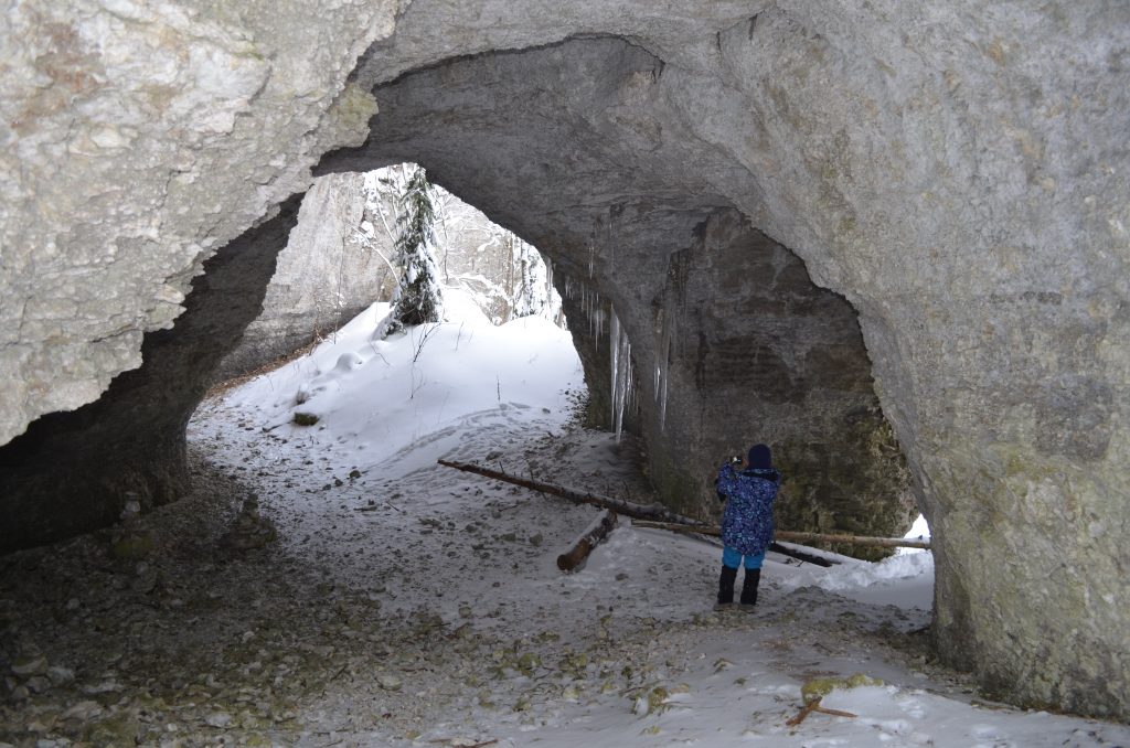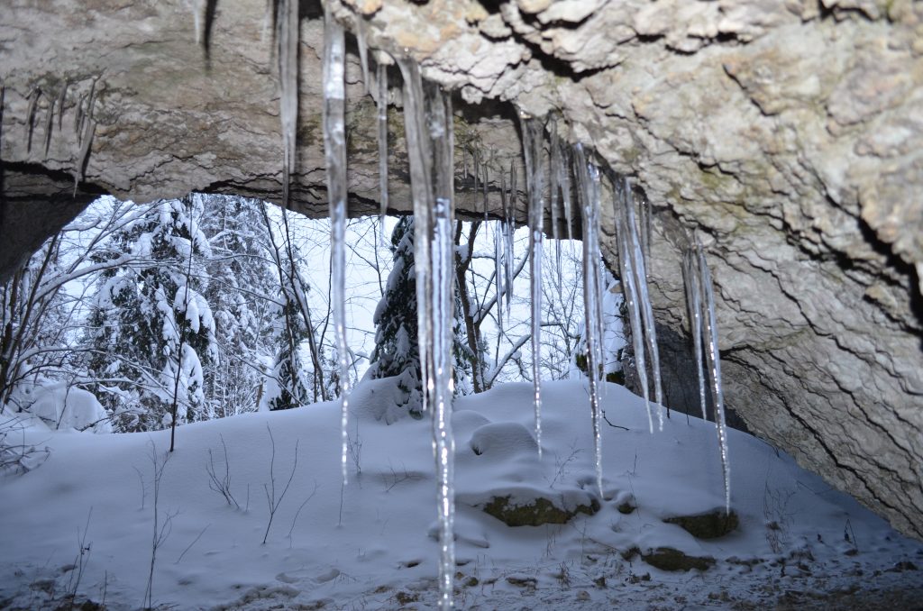 В 11:30-12:00 — прибытие к началу маршрута. Едем на снегоходах по красивой лесной дороге 13 км. Поднимаемся на Малую Талицкую Арку пешком. Гуляем, фотографируемся. Спускаемся и идем в грот к избушке. Пьем чай. Далее пешком идем до Большой Талицкой Арки по лесной тропе (700 метров). Ходим по гроту, фотографируемся. Можно залезть в небольшую пещеру в гроте. Возвращаемся в Талицкий грот к избушке.