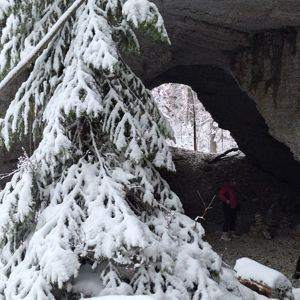 В 11 ч прибытие к началу маршрута. Едем на снегоходах от поселка Усьва мимо ж.д вокзала, где снимали фильм «Чук и Гек», далее по красивой лесной дороге 13 км до избушки Лешего. Там пьем чай. Поднимаемся на Талицкую Арку пешком. Гуляем, фотографируемся. Спускаемся и возвращаемся к избушке Лешего. Далее пешком идем до Большого Талицкого грота по лесной тропе (700 метров). Ходим по гроту, фотографируемся. Можно залезть в небольшую пещеру в гроте. Возврат в избушку Лешего.