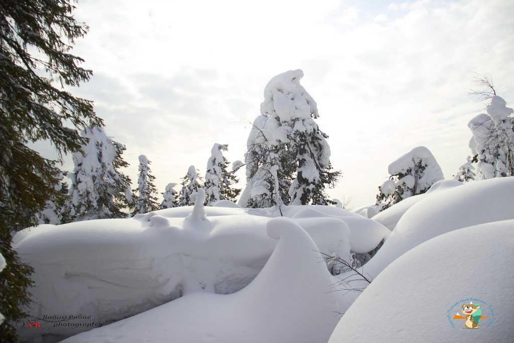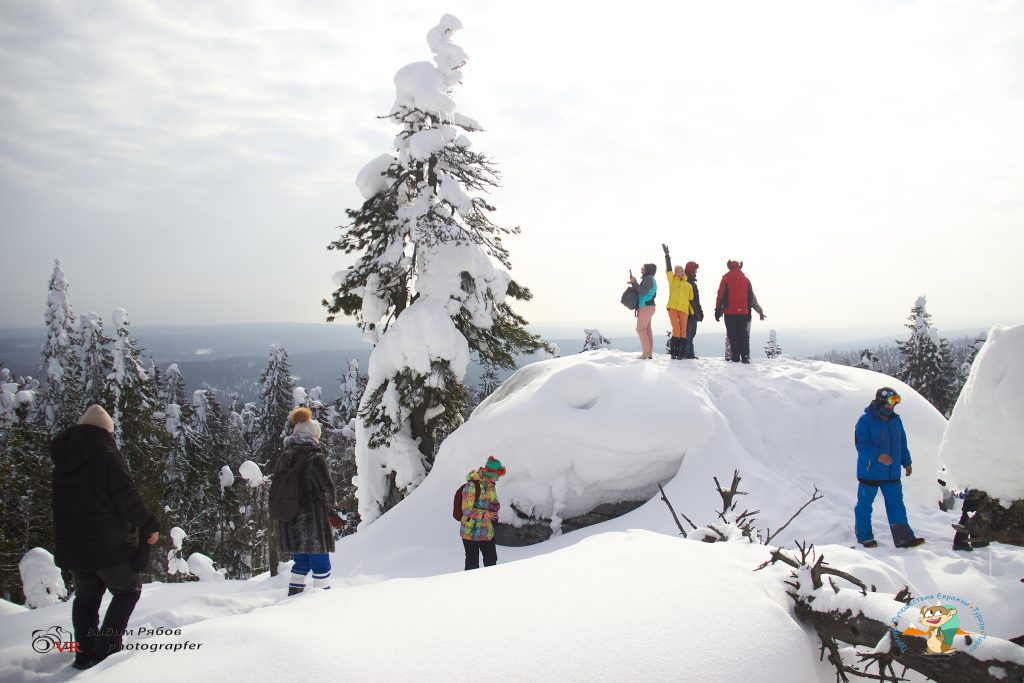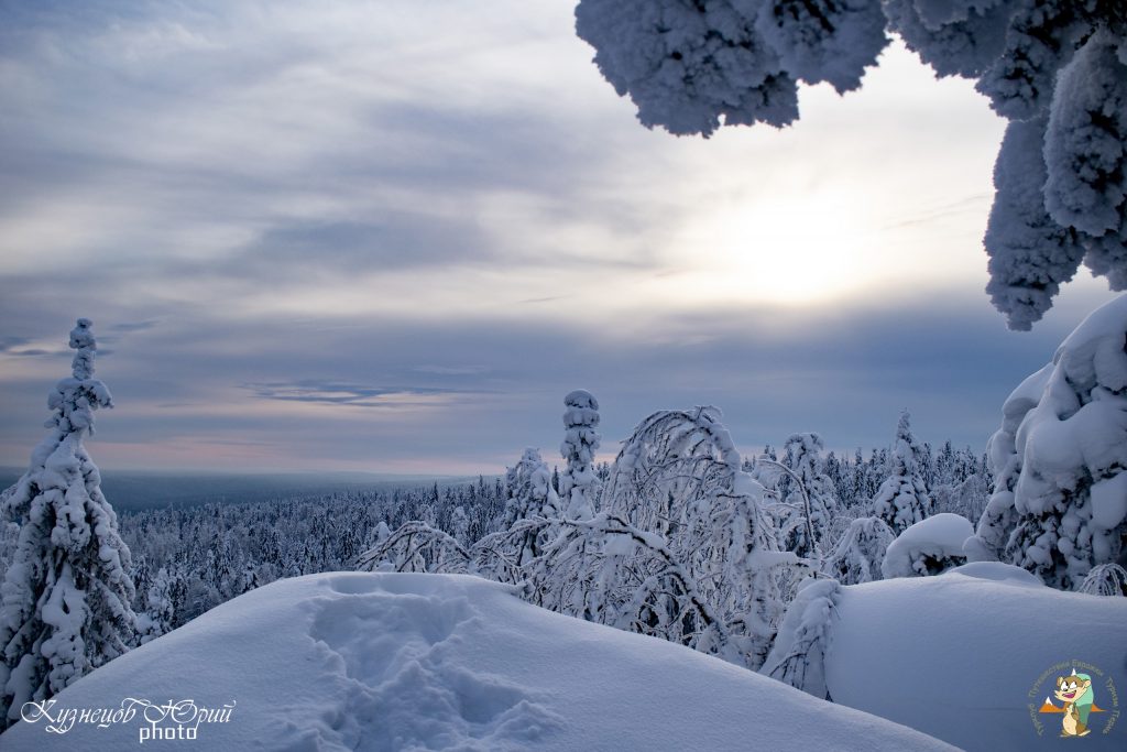 В 12 ч прибытие к началу маршрута от поселка Усьва. Прогулка на снегоходах по красивому лесу до урочища Верхние Копи. По дороге заходим на камень Большой Нос. С него в ясную погоду видно все горы заповедника Басеги, а также п. Юбилейный. Далее по лесу приезжаем к скалам. В пути 6 км в одну сторону (примерно 1 час).