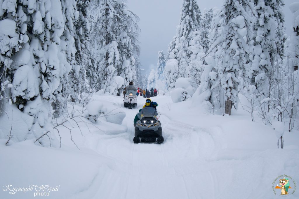 Путешествие проходит на снегоходах по красивому лесу — 6 км в одну сторону.
