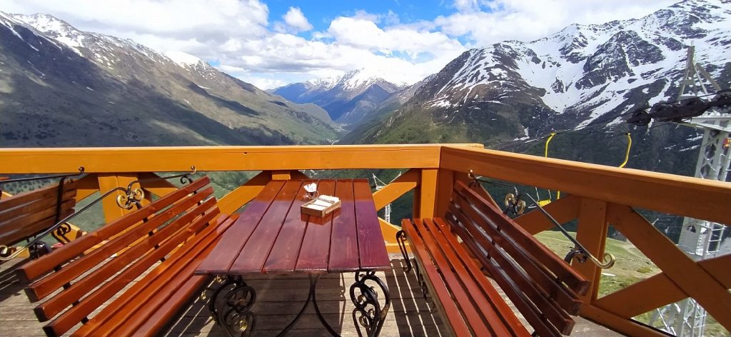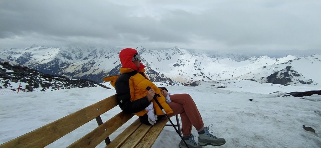 Канатные дороги плавно поднимают туристов на станцию Кругозор, Мир и Гара-Баши. Мы поднимемся на 3850 м! Отсюда открывается прекрасная панорама на главный Кавказский хребет, горы Грузии и знакомые нам вершины Уллу-Тау и Безенги.