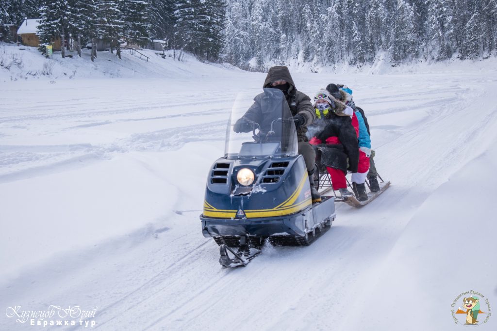 — прокатимся на снегоходах по зимней Чусовой (на самом снегоходе, в санях и на банане),